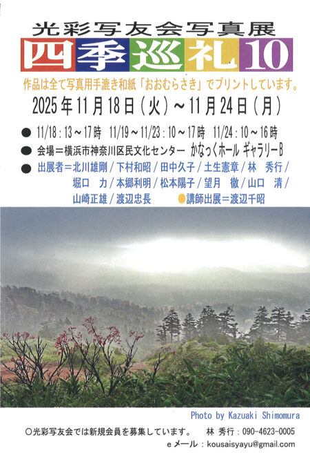 美しい日本の四季と写真家渡辺千昭(JPS)と会員12名が撮影し、手漉き和紙でプリントした作品を展示します。毎年作成しているカレンダーも展示します。 |
