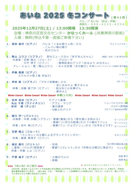 | 開催時間 | 【練習日】12月6日 Aチーム(4歳~6歳 ※未就学児) 10:00~13:00 【練習日】12月6日 Bチーム(小学生) 14:00~17:00 【当日リハーサル】 12月7日 Aチーム(4歳~6歳 ※未就学児) 12:30~14:30 【当日リハーサル】 12月7日 Bチーム(小学生) 9:30~11:30 ★発表会 12月7日(日) 15:00~16:00(14:30開場) |