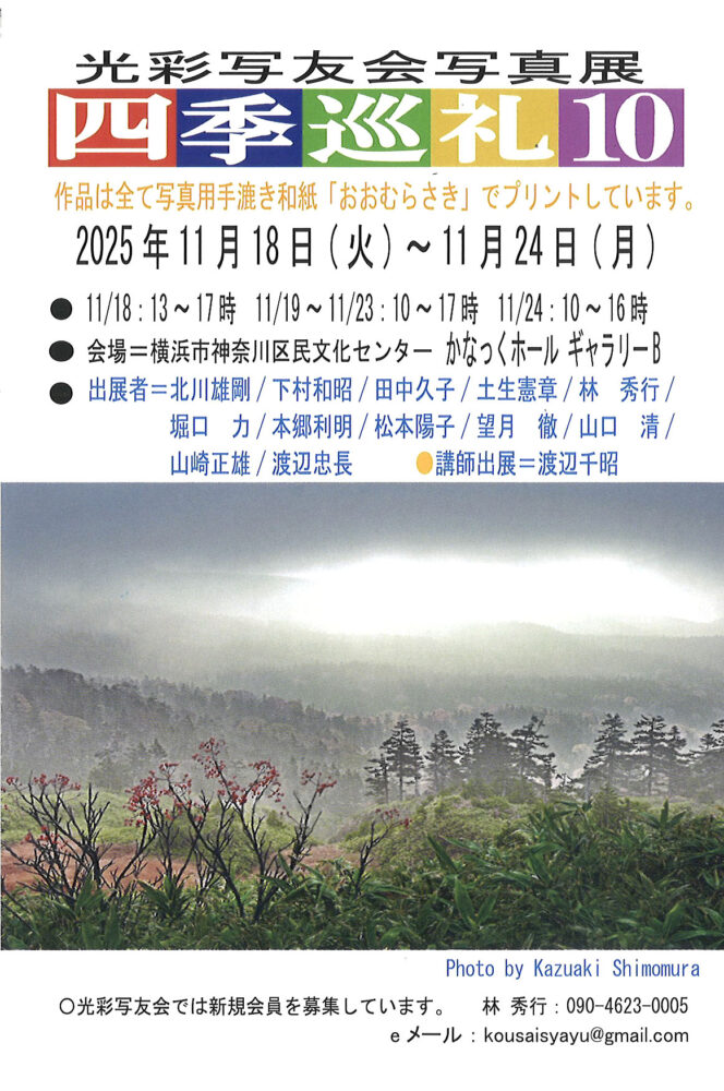 美しい日本の四季と写真家渡辺千昭(JPS)と会員12名が撮影し、手漉き和紙でプリントした作品を展示します。毎年作成しているカレンダーも展示します。