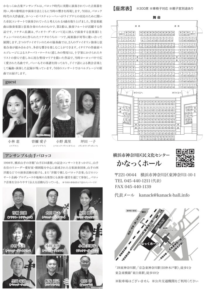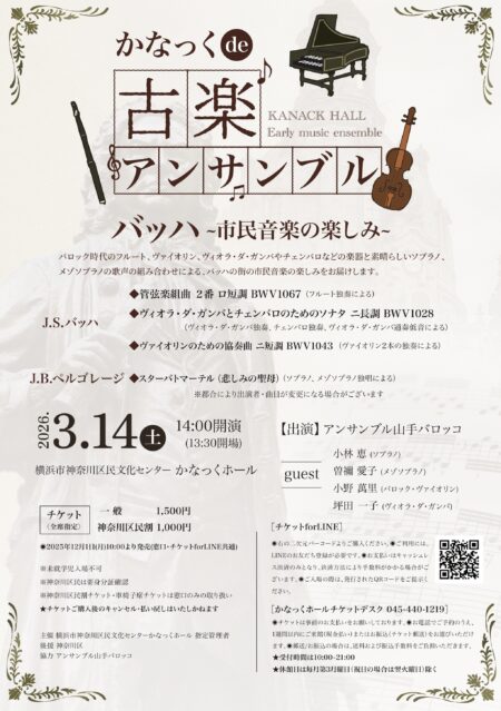 かなっくde古楽アンサンブルは、バロック時代に実際に演奏されていた古楽器を用い、時の歌唱法や演奏方法とともに当時の響きを再現します。今回は、バロック時代の大作曲家、ヨハン・ゼバスチャン・バッハがライプチヒの市民のために開いた市民コンサートで演奏されていたと考えられる4曲を取り上げました。管弦楽組曲は独奏楽器と弦楽合奏のためのもので、第2番は、独奏フルートが活躍する作品です。ソナタニ長調は、ヴィオラ・ダ・ガンバ(足に挟んで演奏する弦楽器)とチェンバロのために作られたソナタのうちの一つで、両楽器が対等に歌い合って展開します。2つのヴァイオリンのための協奏曲では、2人のヴァイオリン独奏と弦楽合奏が組み合わさり、多彩な響きを楽しむことができます。イタリアの作曲家ペルゴレージによるスターバト・マーテル(悲しみの聖母)は、十字架にかけられたキリストの傍らで悲しみに沈む聖母マリアを描いた作品で、当時ヨーロッパ中で広く愛された名曲です。バッハもその楽譜を持っており、ドイツ語による教会音楽として編曲・演奏した記録が残っています。今回のコンサートではペルゴレージの原曲でお届けします。