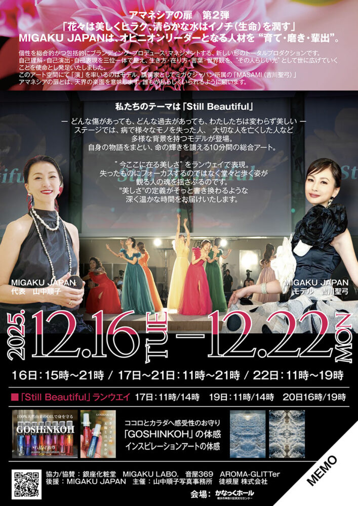 山中順子総合アートの世界は、写真インスピレーションアート・精神世界を中心に、魂の扉が開く時空間を演出している。 今回は女性たちのランウェイショーも開催される、美の本質を体感して下さい。
