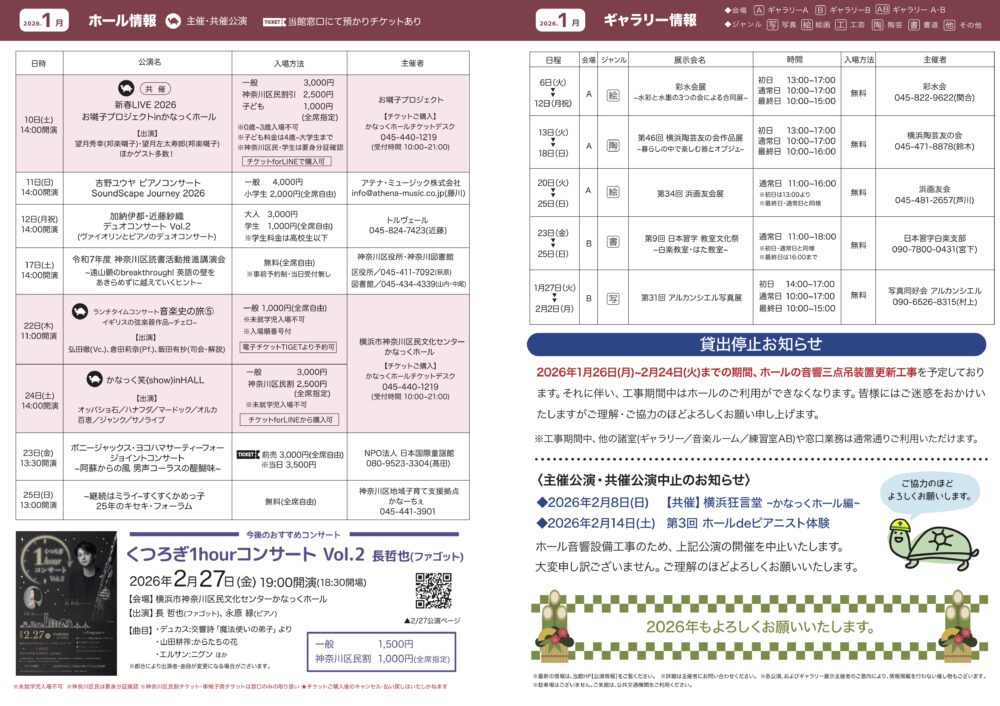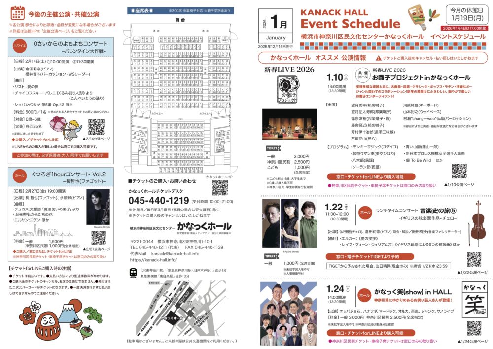 「かなっくホールイベントスケジュール」2026年1月号を発行します。ぜひお手にとってご覧ください。
