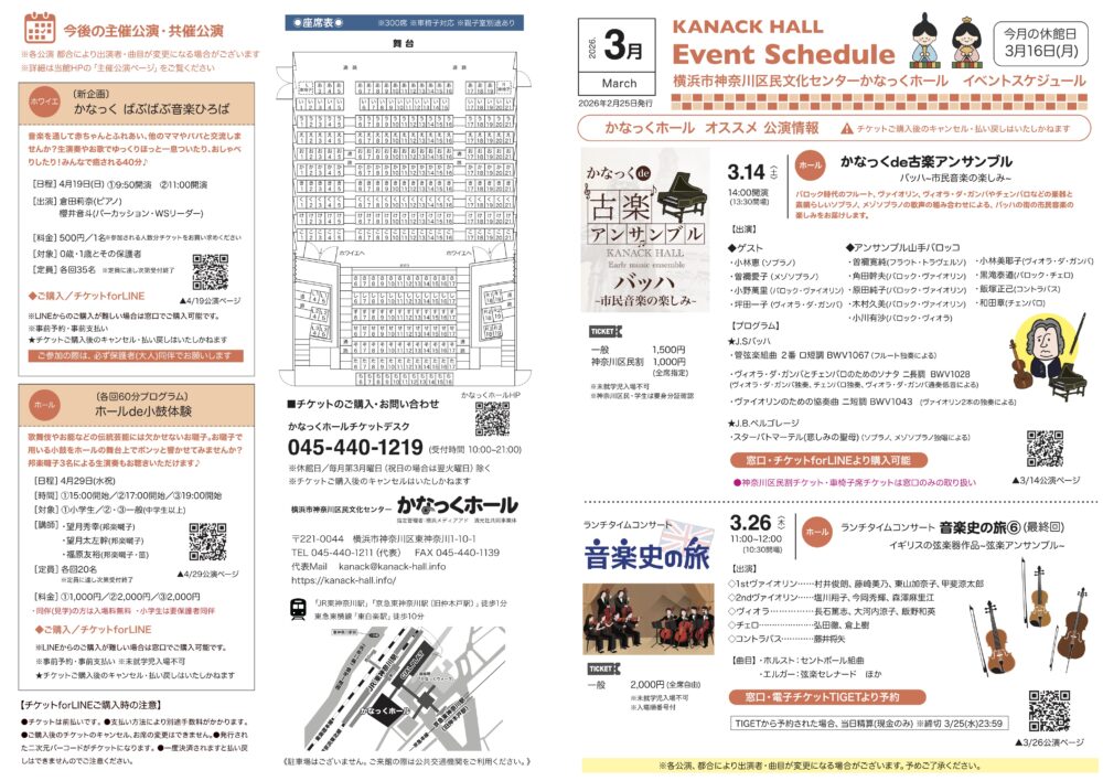 「かなっくホールイベントスケジュール」2026年3月号を発行します。ぜひお手にとってご覧ください。