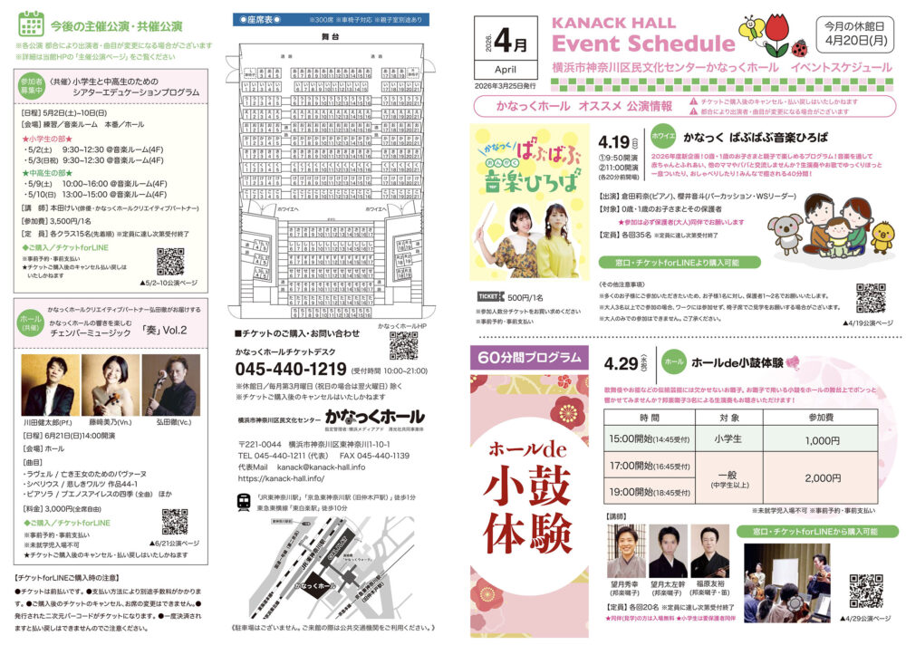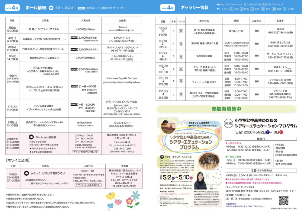 「かなっくホールイベントスケジュール」2026年4月号を発行します。ぜひお手にとってご覧ください。