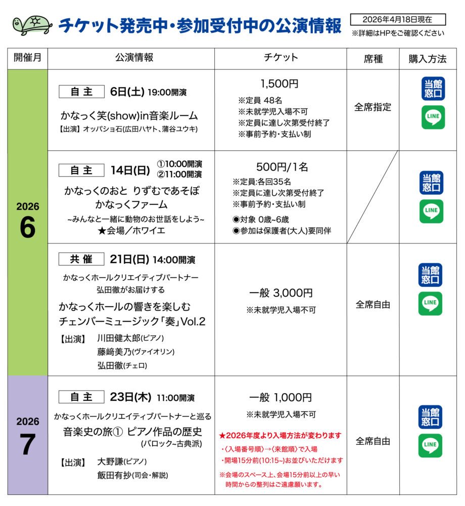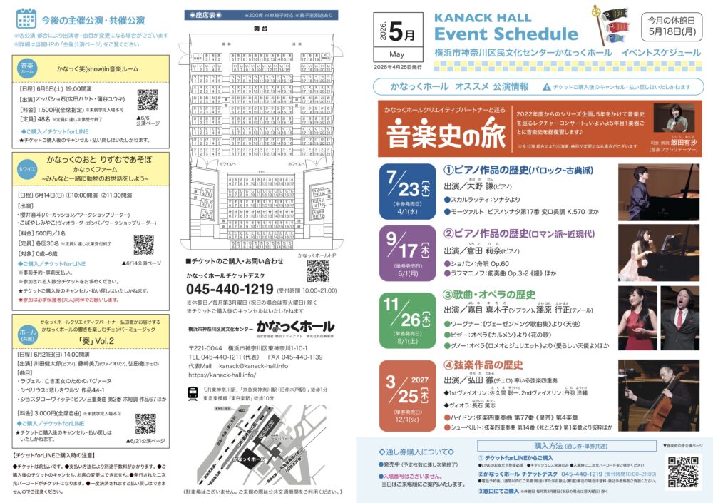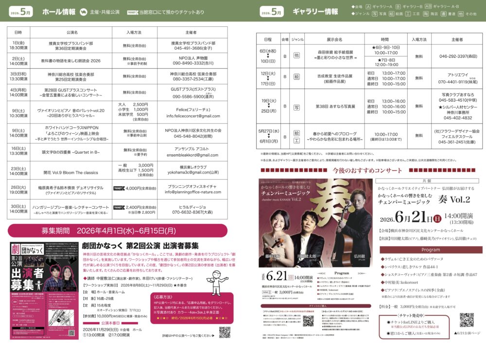 「かなっくホールイベントスケジュール」2026年5月号を発行します。ぜひお手にとってご覧ください。